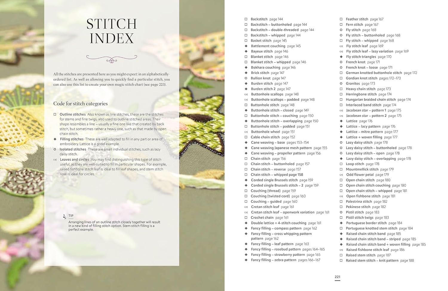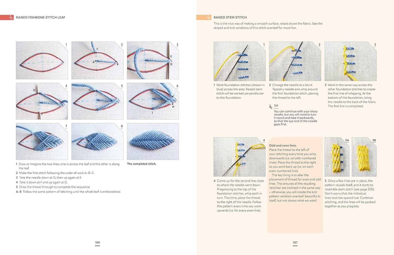 A full stitch directory with more than 130 crewelwork stitches explained step by step, from back stitch to woven wheel.