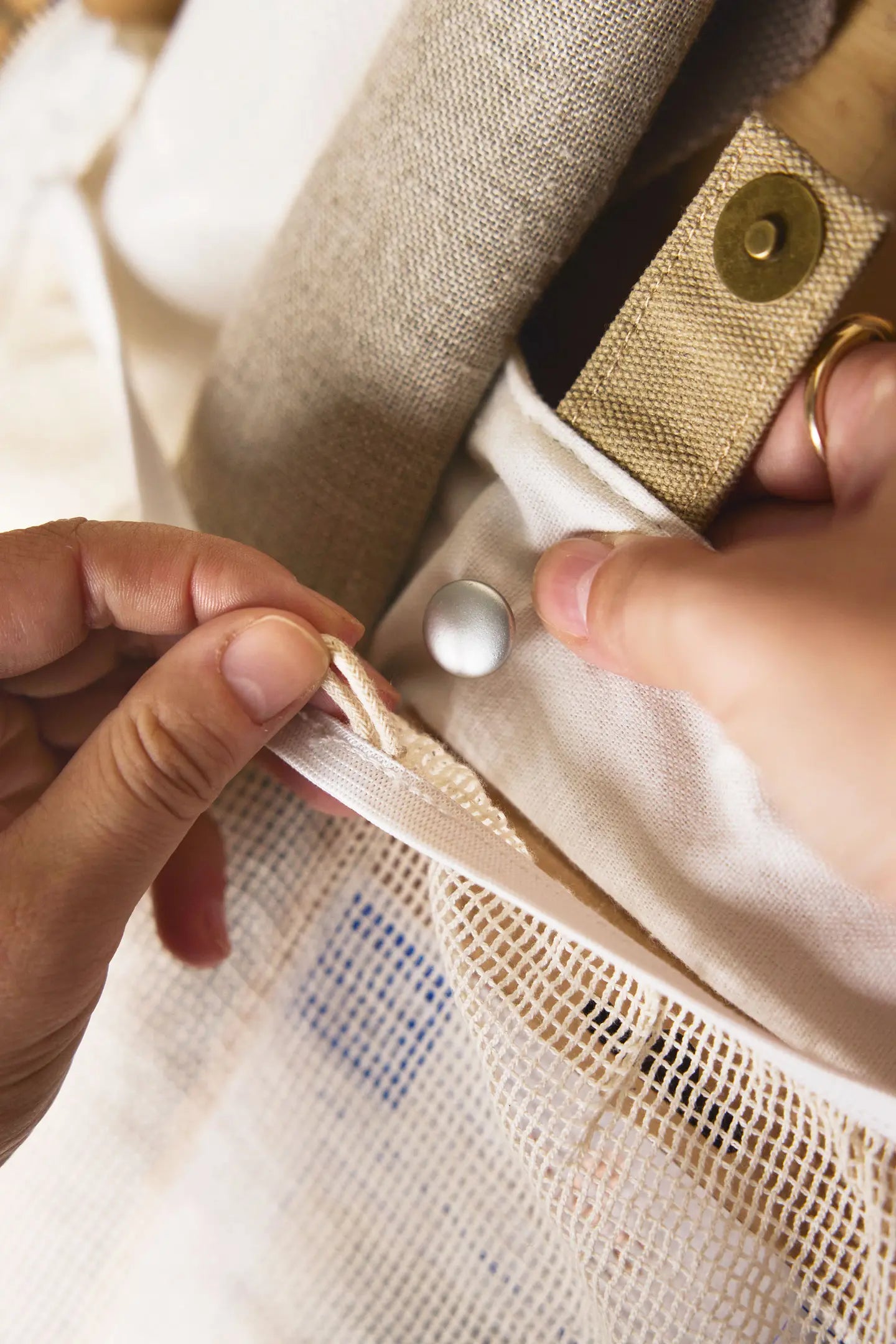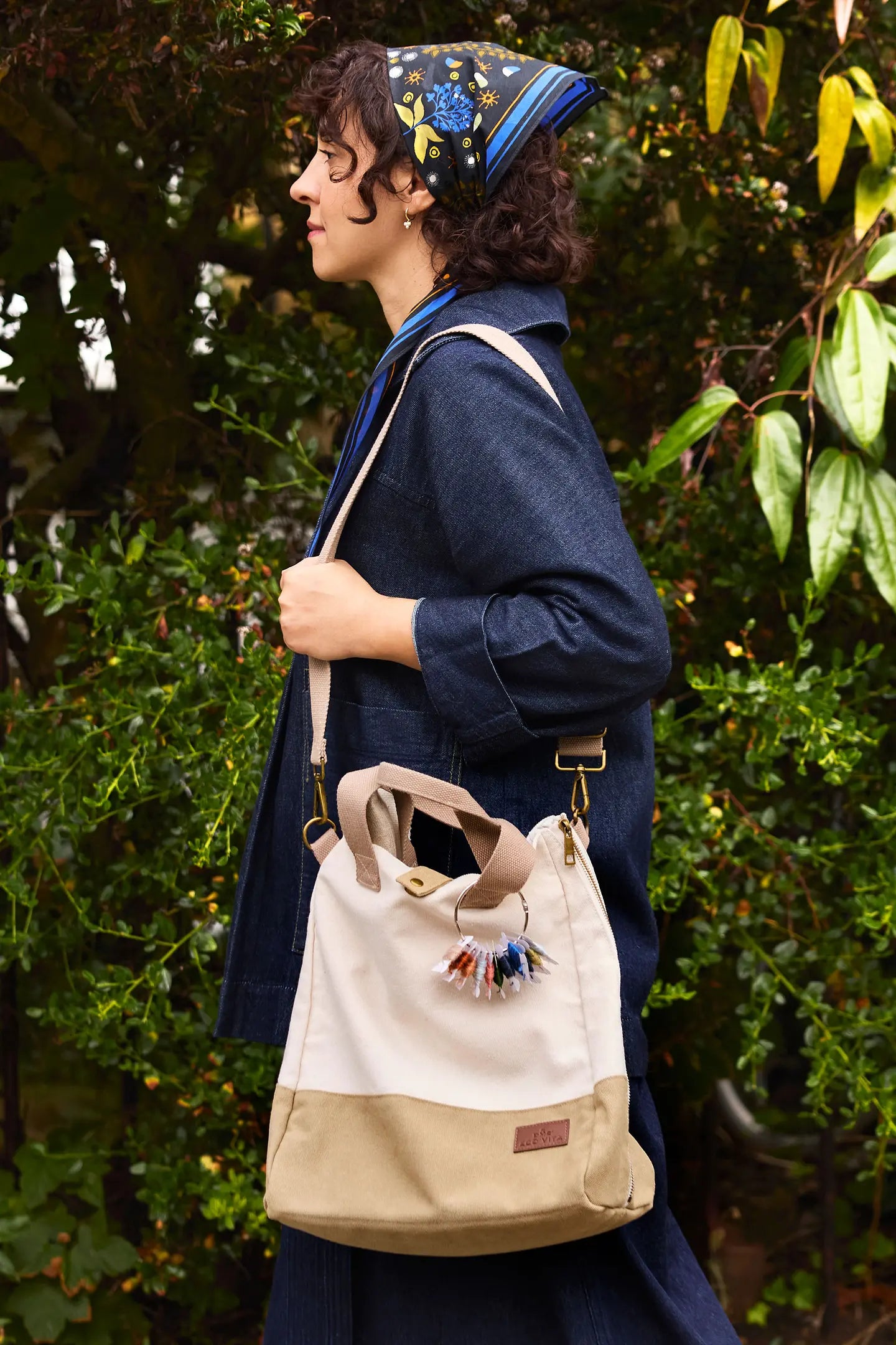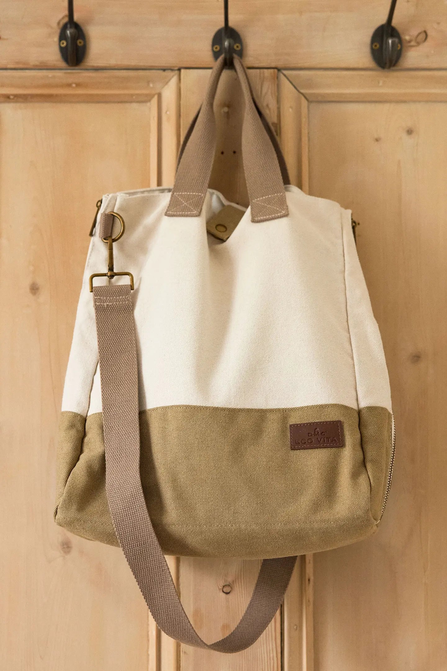 Never be without soothing needlecraft at your fingertips with this sustainable Nomad Tote Bag. This stylish ecru and khaki tote has taupe handles, an adjustable shoulder strap and magnetic snap closure. The long side zips of this large capacity bag allow you to open it completely flat making it easy to access everything. Organise all your supplies effortlessly in the large mesh compartment and three zip pockets. The modern design is finished with a leather label embossed with the DMC Eco Vita logo.